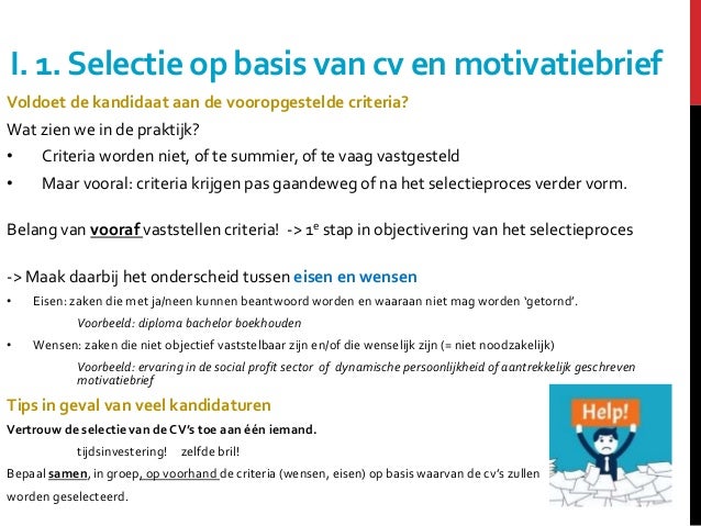 En als een bedrijf zoekt in de cv database zien ze alleen je cv. Ruim er dus voldoende tijd voor in. Maak je sollicitatiebrief kort en bondig. Bedenk dat de recruiter je brief in het slechtste geval 1x keer leest en direct overtuigd moet zijn. Bouw de selectie als volgt op. Zo is het bijvoorbeeld slim om meerdere personen te betrekken bij de beoordeling van de sollicitatiebrieven en een referentiecheck te doen.
