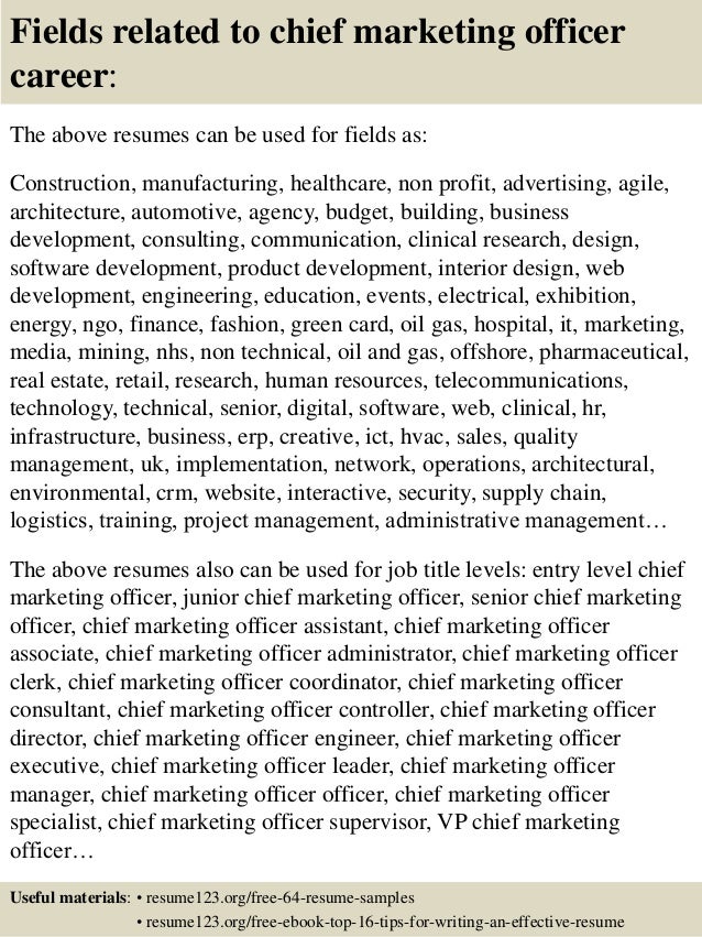 Chief marketing officer resume. Inspiring visionary chief marketing officer and thought leader with a balanced approach to building a top global brand by blending art commerce creativity and science to design and execute iconic campaigns that capture consumers hearts and minds. Workblooms resume templates all come with matching cover letters. How to write the best chief marketing officer resume. Marketing officers are responsible for communicating a companys marketing message and managing campaigns. Present the most important skills in your resume theres a list of typical chief marketing officer skills. Typical samples resumes for marketing officers describe duties such as brand promotion helping design the annual sales plan planning marketing events writing sales copy and reporting to the marketing manager.