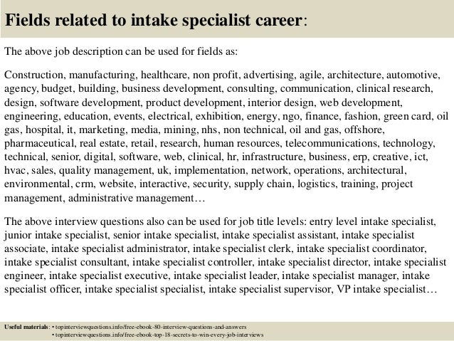 Legal intake specialist the law offices of weitz luxenberg new york ny. Entered client case data into computer system compiled information through investigations. The intake specialist job description requires an individual who is able to pay very close attention to detail and get required information from clients and customers.