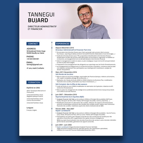 Directeur administratif et financier en environnement international né en 1958 erp iasus gaap sarbanes oxley anglais espagnol et portugais professionnels italien et allemand perfectibles mes atouts. Cette semaine cest le cv de bruno directeur administratif et financier qui a été tiré au sort dans le cadre de notre opération améliorez votre cv en un clic. Accueil expériences formations compétences portfolios loisirs. Directeur administratif et financier. Coordinateur pour la partie customer relationship management cognos reporting et consolidation. Directeur administratif et financier.