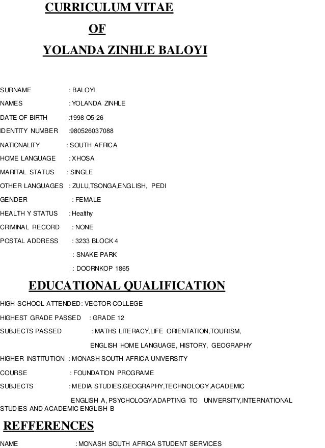 Curriculum vitae first name last name address phone. Box 2526 polokwane 2069 073 555 9897 dsunter at onetwocoza personal details id number.