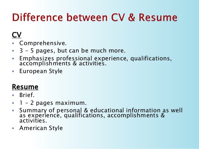 A resume is typically written in a formal style using the third person and you should use as few words as you can to get your experience across keep it short and simple. A resume is a broad overview of your educational and career historyit can list most or all of the relevant skills and professional experiences that apply to your current. It is a snapshot of the career history of the candidate which is indeed the primary phase in getting. A cv curriculum vitae is different from a cover letter in that a cover letter is more concise and a cv is fairly detailed. Thats because a cv includes more information than a resume. A cv has a clear chronological order listing the whole career of the individual whereas a resumes information can be shuffled around to best suit the applicant.