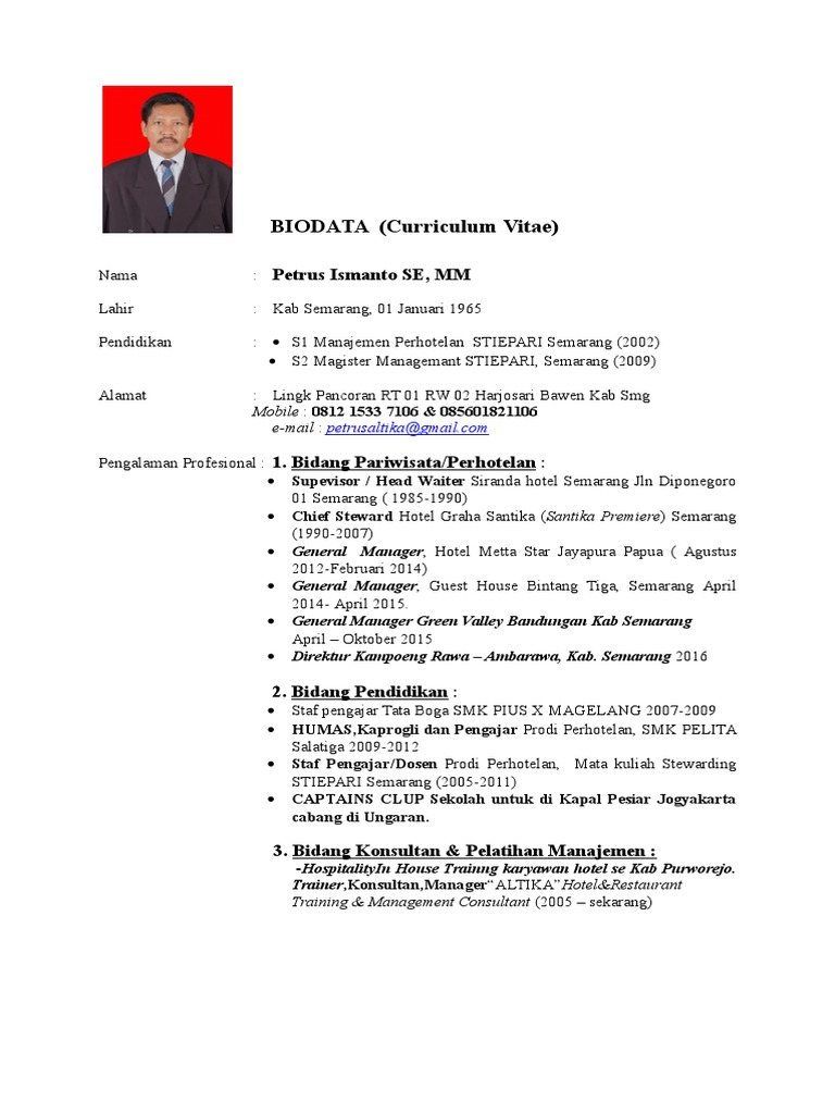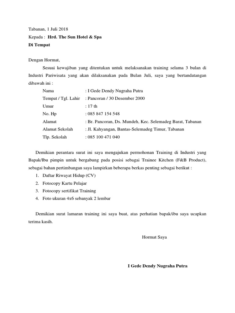 Resume atau daftar riwayat hidup dalam bahasa inggris kadang juga diperlukan meskipun bekerja di perusahaan instansi dalam negeri. Silahkan gunakan contoh surat lamaran training dibawah ini dan silahkan dimodifikasi sesuai bidang dan jurusan kuliah masing2. Berdasarkan informasi yang tertera di jobfair yang diadakan di its pada 1 agustus 2014. Bekerja di jazz hotel yogyakarta februari 2017 sekarang sebagai front office manager. Demikian daftar riwayat hidup ini saya buat dengan sebenar benarnya dan dapat digunakan sebagaimana mestinya. Cv curriculum vitae merupakan dokumen lengkap yang memuat secara rinci tentang latar belakang pendidikan pengalaman kerjabiodata prestasi serta pencapaian pencapaian tertentu selama anda menjalani karir.