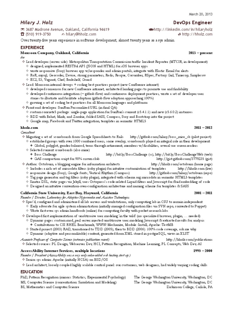 And thanks to open world of moocs and opencourseware that employers are now hiring entry level professionals with no prior devops experience. Resourceful devops manager with 6 years of experience seeking to use solid continuous deployment skills to drive efficiency measures at firmalent. Devops sample resumes for 2 5 years experience. At least 2 years experience in envision design and implement devops solutions at least 3 years experience in global 1000 technology consulting at least 3 years experience in articulating the benefits of leveraging ibm devops assets including rational urbancode and the rational almclm products offerings to reduce costs and speed time to market. Design and develop continuous deployment pipeline integrating test kitchen vagrant git jenkins and chef across geographically separated hosting zones in aws azure and google compute. Devops sample resumes for 0 2 years experience.