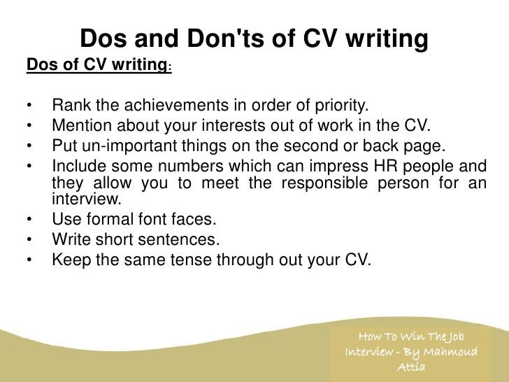 The dos and donts of cv writing eleanor collins 29052017 the way you present your cv can have an overwhelming influence over whether your cv is even read let alone get you that all important interview. Dos of cv writing make your contact details ie. You can use the information in this article to help you understand all of the resume dos and donts when you write your own resume. By robert half on april 25 2017 at 512pm resume tips and resources sometimes understate the difficulty of skillfully summarizing an entire career on a single page. Hiring managers and recruiters may review hundreds of resumes for each open position so a short resume ensures they can read it quickly. Here are some of the elements to include in your resume.