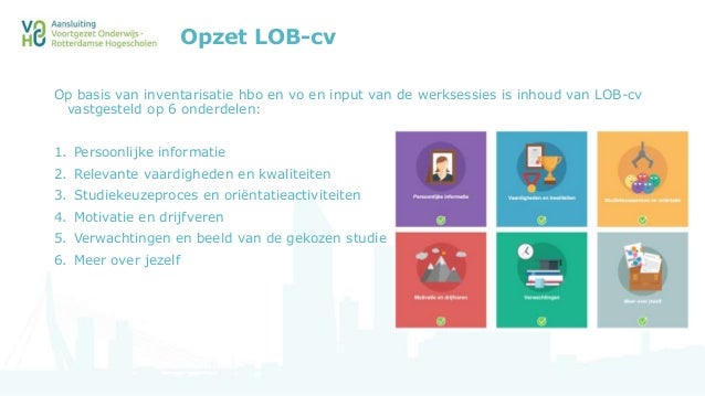 Het lob ontwikkelteam rotterdam heeft in schooljaar 2015 2016 een bijdrage geleverd aan de verbetering van de overgang vo en hbo door te werken aan de ontwikkeling van ideale lo. Naar het voorbeeld van een aantal hbo opleidingen die vorig jaar al het lob cv naar volle tevredenheid gebruikten bij de studiekeuzecheck gaan we nu de pabo thomas more hogeschool alle opleidingen van hogeschool inholland van de locatie rotterdam en een groot aantal opleidingen bij hogeschool rotterdam het lob cv inzetten bij de studiekeuzecheck enof intake en vragen de aankomend student.