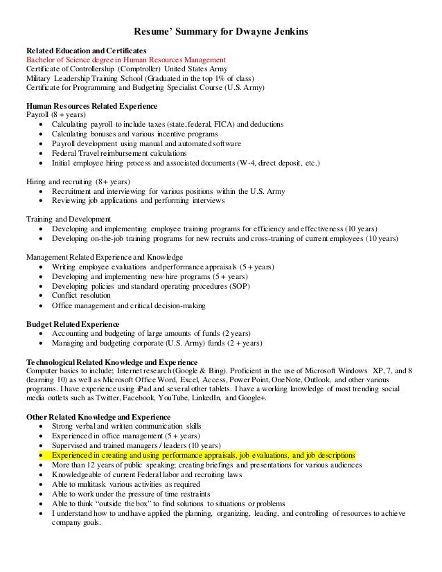 When writing your resume be sure to reference the job description and highlight any skills awards and certifications that match with the requirements. Human resource professional with over 16 years of comprehensive human resource experience including recruitment and retention conflict resolution labor relations and benefits administrationi have experience collaborating with senior management to conduct human resources strategic planning in order to support and further corporate goals. Human resources specialists work in a variety of organizations where they manage and guide employees. A well written resume sample for human resources specialist emphasizes the following responsibilities. You may also want to include a headline or summary statement that clearly communicates your goals and qualifications. Human resources specialist gs 0201 124 summary human resources specialist with over a decade of experience in administering federal benefits and benefits programs providing excellent customer service teamwork and cooperation technical proficiency and the ability to communicate exceptionally well both verbally and in writing.