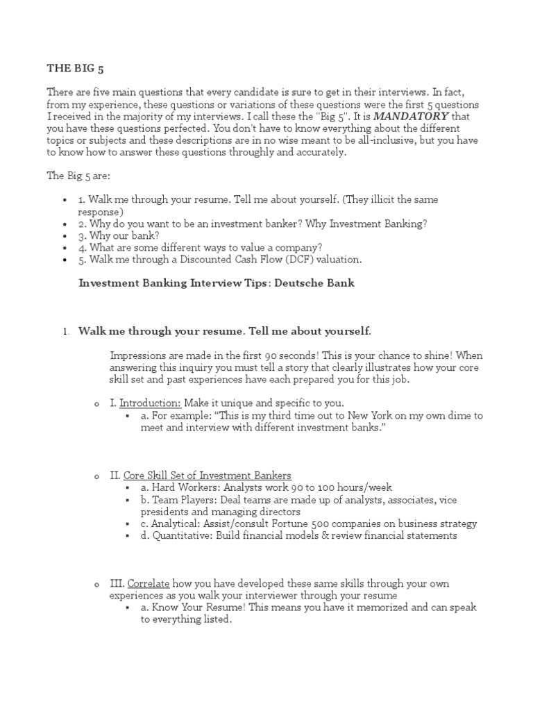 Tell me a little bit more about your background. This will make your walk through seem unfocused and may make the interviewer doubt your ability to communicate succinctly to customers or clients. Not giving enough detail will make your answer seem superficial. Walk me through your resume. You must have previous experience whether youre an undergrad or a career changer at the mba level you need previous finance experience ie a sequence of internships to have any chance of getting into ib. It should also be the easiest question to answer for 2 reasons.