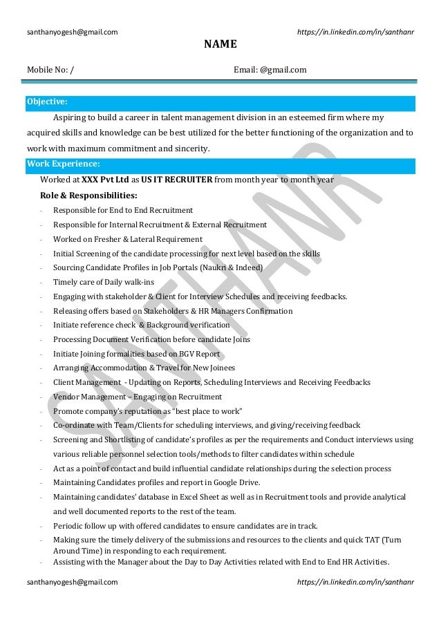 As mentioned above and illustrated by these recruiter resume samples the work experience section of your resume will vary based on your preferences and the needs of your target employers. It recruiters find screen and hire job applicants within the information technology sector. By using one of resumeios field tested resumes you can create a stronger recruiter resume that will impress hiring managers. A winning recruiter resume should be chock full of both soft and hard skills that highlight your ability to achieve staffing objectives. As a talent professional you know that in order to be considered for top recruiter jobs you need a comprehensive resume. And leveraging candidate.