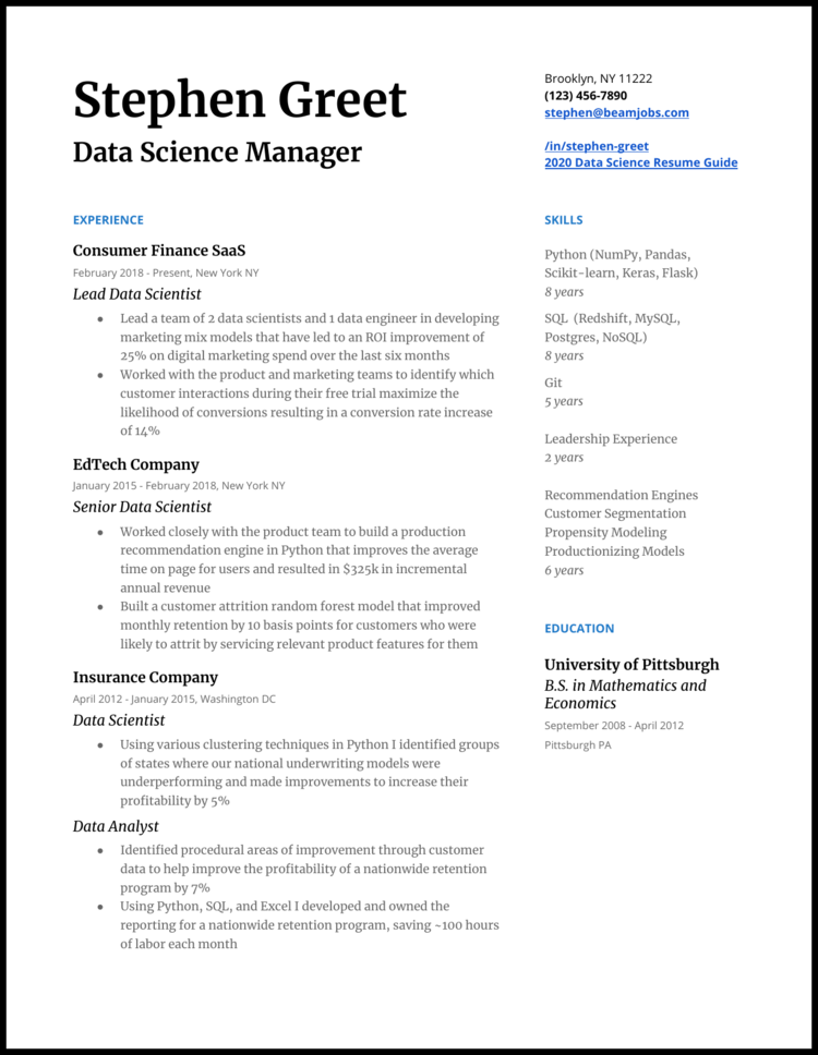 We started off with all the key hard skills for the job. Junior data scientist resume samples 46 42 votes for junior data scientist resume samples. A data scientist resume example better than 9 out of 10 other resumes. Its actually very simple. Writing a resume for data science job applications is rarely a fun task but it is a necessary evil. How to write a data scientist resume that lands more interviews.