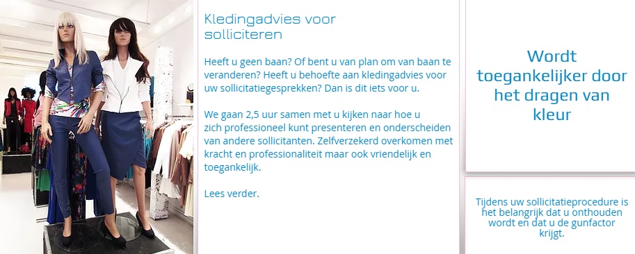 In onze winkels helpen wij jou bij het samenstellen van een nieuwe outfit en de manier waarop jij je presenteert. En er is geen gouden regel. Een pet of hoed laat je thuis en je draagt niet te veel deodorant of parfum. Dress for success heeft winkels in het hele land waar mensen met een uitkering of een minimuminkomen gratis representatieve kleding uit kunnen zoeken. Geen trekkende stof bij de knoopjes. Een sollicitatie staat namelijk een beetje los van de daadwerkelijke aard van het werk.
