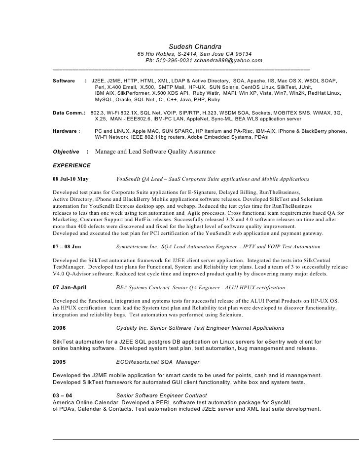 Lead software qa engineer resume. Writing the software test lead resume first you can understand that besides your technical skills you must also be a good manager and describe your management skills in your resumeresponsibilities of a test leaders tend to include involvement in the planning monitoring and control of the testing activities and tasks. You may also want to include a headline or summary statement that clearly communicates your goals and qualifications. When writing your resume be sure to reference the job description and highlight any skills awards and certifications that match with the requirements. Lead qa engineer end user systems resume examples samples coordinate with project stakeholders to determine risk priority urgency and coverage for new and existing implementation efforts develop and help to implement best in class processes and procedures to ensure high quality delivery with minimal risk to the end user community. 15 yrs 8 mo. Lead test engineer at parexel international.