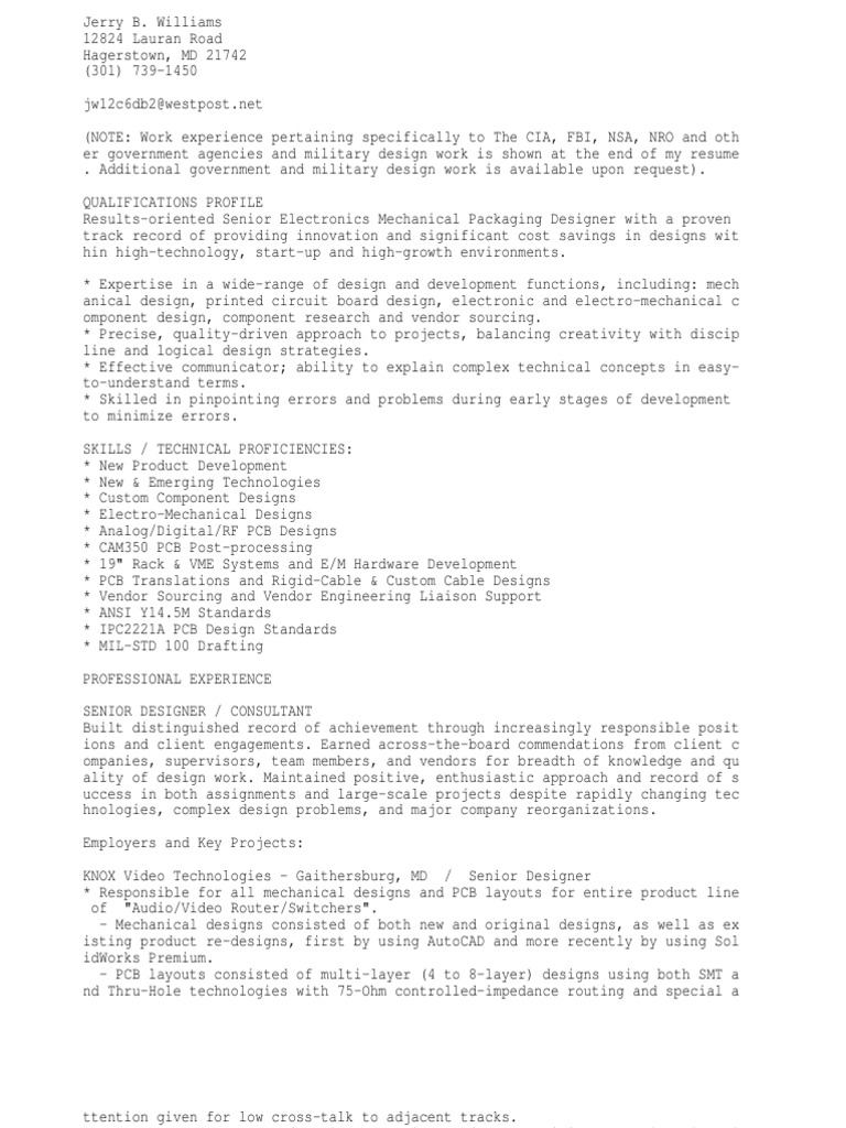 Due outsourcing to india there is no sustainable contract work in the area. 6 10 years pcb design experience on a recognized cad development platform preferably in an aerospace or other high reliability environment experience with ipc. Demonstrated the ability to write detailed test and maintenance procedures. Senior pcb designer profile detail oriented professional with more than 20 years of cad experience in the printed circuit design of backplanes rigid and flex circuits for various industries that include medical security commercial and military.