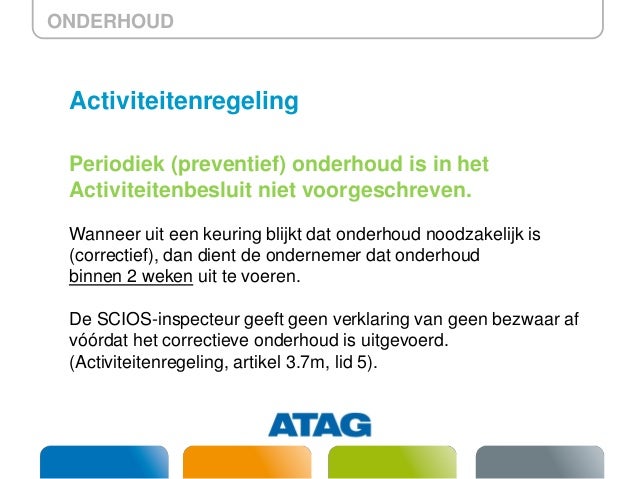 Dit is een wettelijke eis die in het activiteitenbesluit is opgenomen. Xyz001 inspectie referentie. Jaarlijks moet het periodiek onderhoud po worden uitgevoerd. 1 periodiek onderhoud po scope 1 atmosferisch toestel aardgas scios identificatiecode. De po er is bevoegd instellingen te wijzigen binnen de bandbreedte die de ebier heeft vastgelegd in het basisverslag. Paragraaf 321 van het activiteitenbesluit geeft voor stookinstallaties eisen voor keuring en onderhoud.