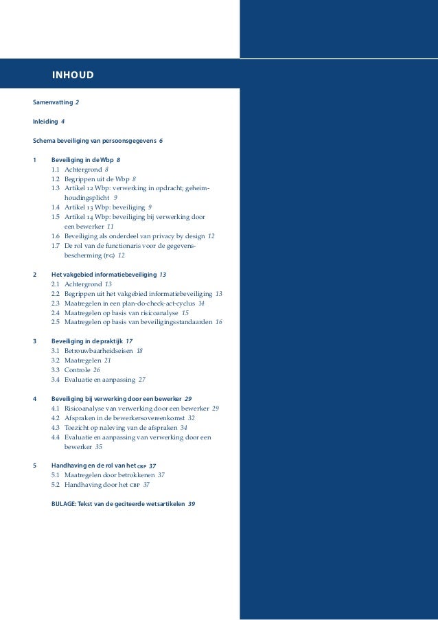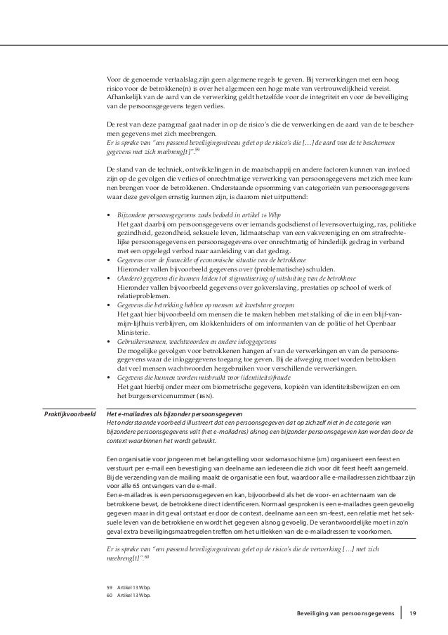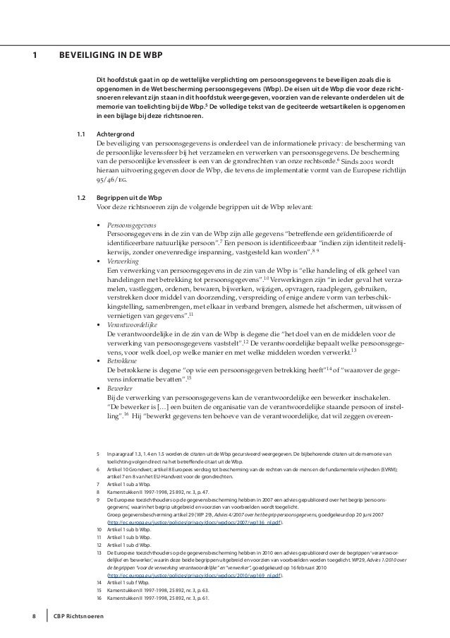 Deze richtsnoeren zijn in beginsel slechts van kracht bij de verwerking van persoonsgegevens ze moeten echter eveneens worden toegepast in het kader van machtigingen verleend door elk van de sectorale comités ingesteld bij de commissie voor de bescherming van de persoonlijke levenssfeer. De richtsnoeren leggen uit hoe het cbp bij het onderzoeken en beoordelen van beveiliging van persoonsgegevens de beveiligingsnormen uit de wet bescherming persoonsgegevens wbp toepast. Daarbij heeft een organisatie de ruimte om de beveiliging van persoonsgegevens in te richten op de wijze en met de middelen die in de specifieke situatie van deze organisatie het meest passend zijn. De beveiliging van persoonsgegevens is al lange tijd een topprioriteit van de autoriteit persoonsgegevens ap. Daarbij heeft een organisatie de ruimte om de beveiliging van persoonsgegevens in te rich ten op de wijze en met de middelen die in de specifieke situatie van deze organisatie het meest. Beveiliging van persoonsgegevens 3 tot slot met deze richtsnoeren wil het cbp duidelijk maken wat het van de beveiliging van persoonsgegevens verwacht.
