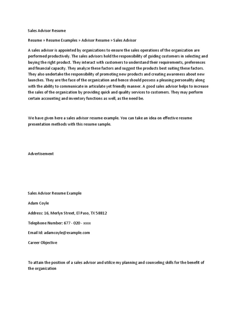 Bringing strong dedication to meeting and exceeding sales goals. Sample objectives for sales advisor resume looking for a sales advisor position with topshop. Here are a few objective examples to help you write your own. Looking for cover letter ideas. Some sales advisor resumes may display qualifications in marketing business or sales. Seeking a sales advisor position at the retail hub.