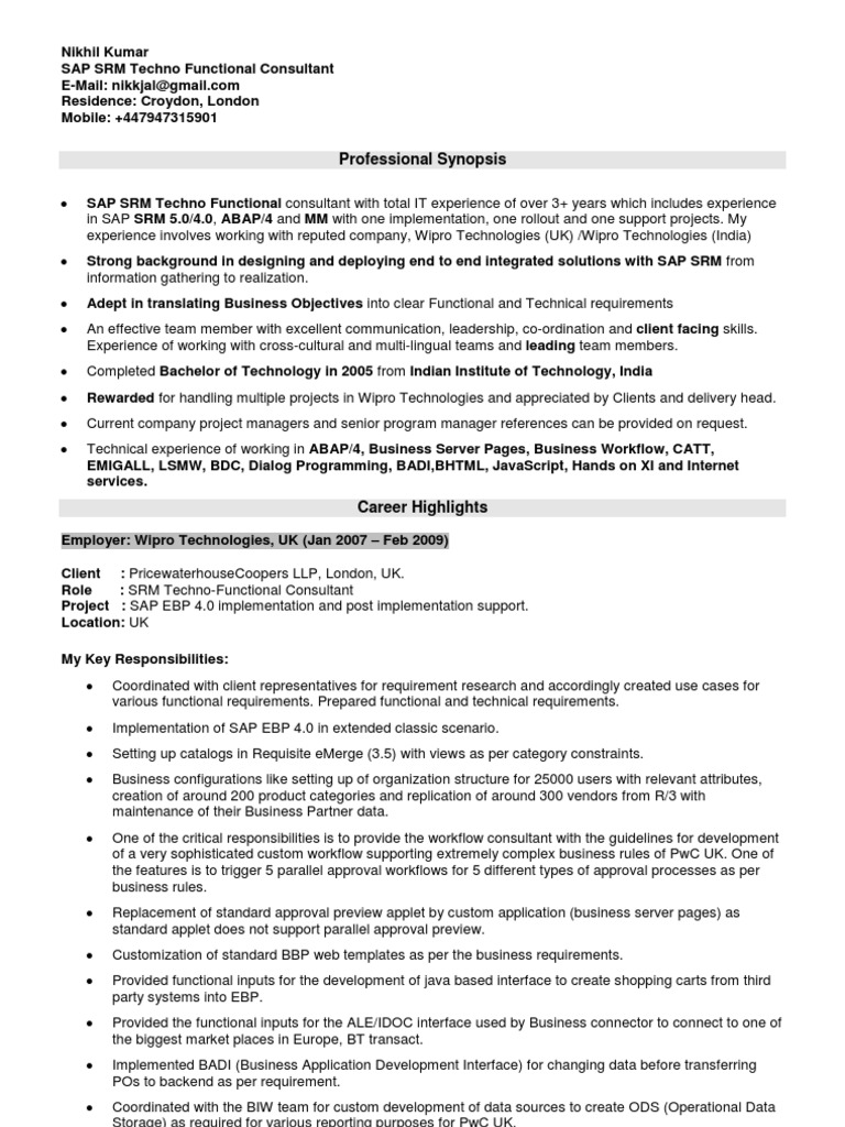 Example of sap consultant resume. These consultants must be effective communicators and team workers giving presentation and coordinating changes with the various departments involved. Example resumes for this position highlight skills like integrating fico related activities with other modules viz. When listing skills on your sap consultant resume remember always to be honest about your level of ability. Sap support specialists provide functional support with the sap product to help resolve users issues. Coordinating the sap supportenhancement activities between off shore teamand us team.